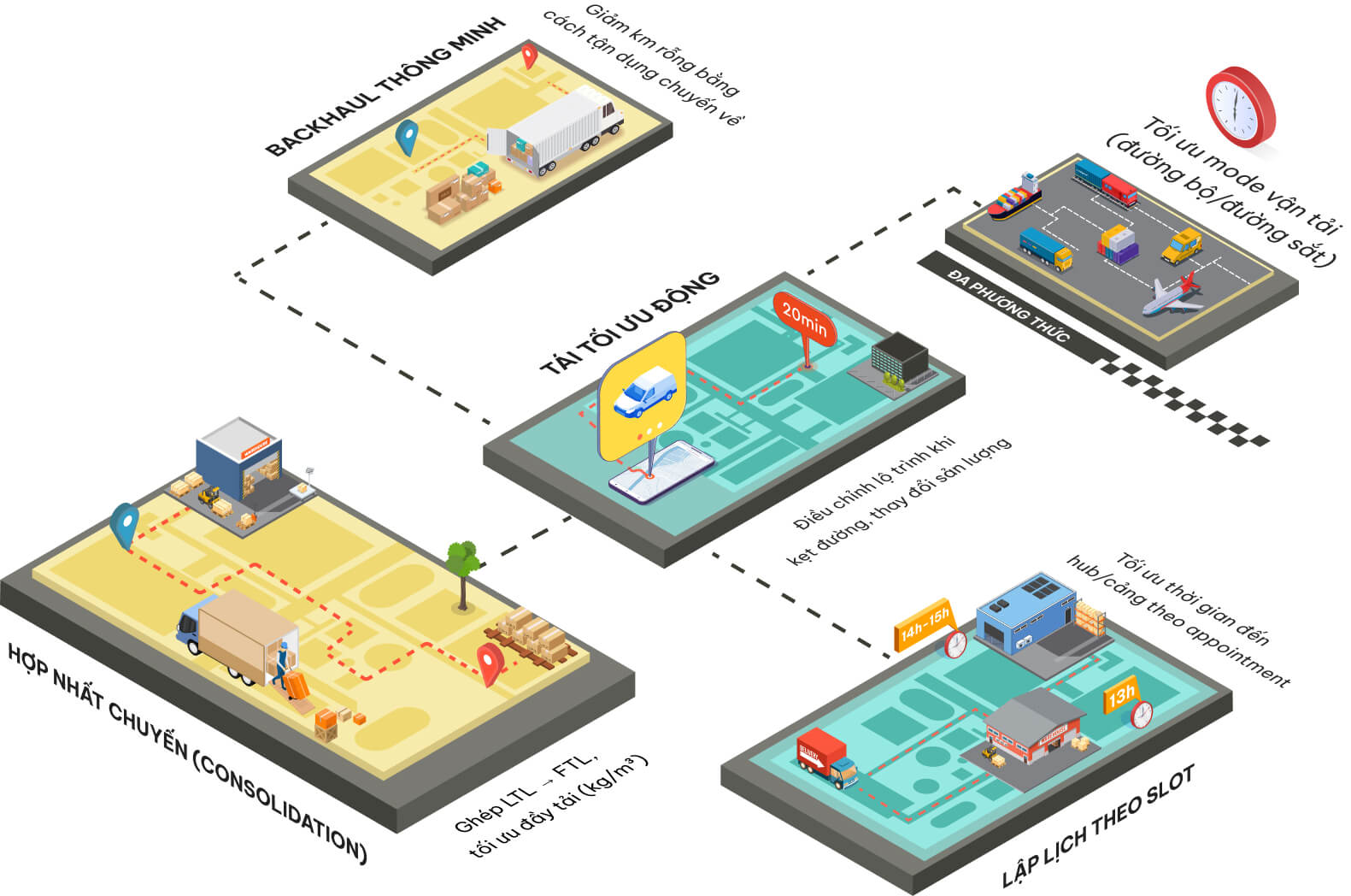 Giảm 5-15% chi phí line-haul; giảm 10-20% km rỗng; tăng 5-12% đầy tải.